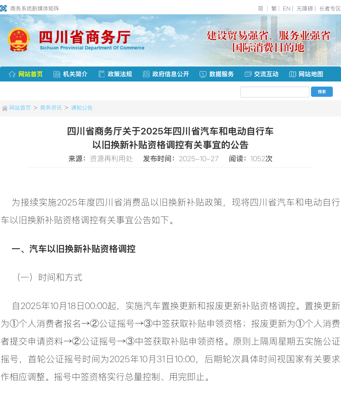 10月27日晚,四川省商务厅发布公告称,自2025年10月18日00:00起,实施汽车置换更新和报废更新补贴资格调控,实施公证摇号申领。电动自行车则采取个人消费者领取资格券的方式,确定补贴申领资格。