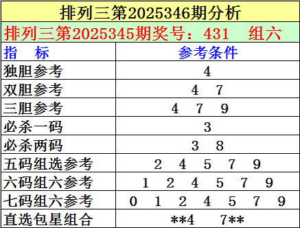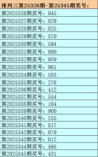 1.排列三最近十期分别开出号码:412-554-164-900-255-817-079-012-495-431,其中有6期奖号开出了上期的重复号码,本期预计第2025345期奖号:431中有重号,参考号码:4。