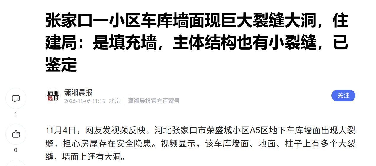 据潇湘晨报发布,11月4日,网友发视频反映,河北张家口市荣盛城小区A5区地下车库墙面出现大裂缝,担心房屋存在安全隐患。视频显示,该车库墙面、地面、柱子上有多个大裂缝,墙面上还有大洞。