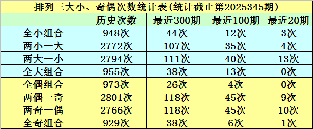 连续10期奖号中,两大一小形态开出5期,全大形态开出0期,全小形态开出3期,两小一大形态开出2期,本期大小形态判断:两小一大奖号。