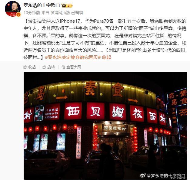9月15日,罗永浩发文表示,决定放弃进一步追究西贝。