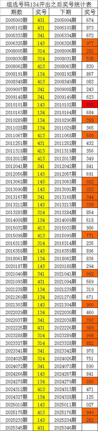 从上表可以看出,组选号码134开出之后,出现次数最多的三个号码分别为:893,本期防这三码中落号;出现次数最少的三个号码分别为:105,本期预计这三个号码不会同时出现,本期杀一码:1。