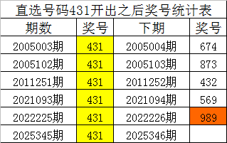 从上表统计可以看出,直选号码431开出之后,其下期奖号: